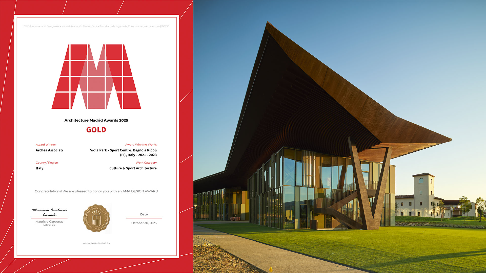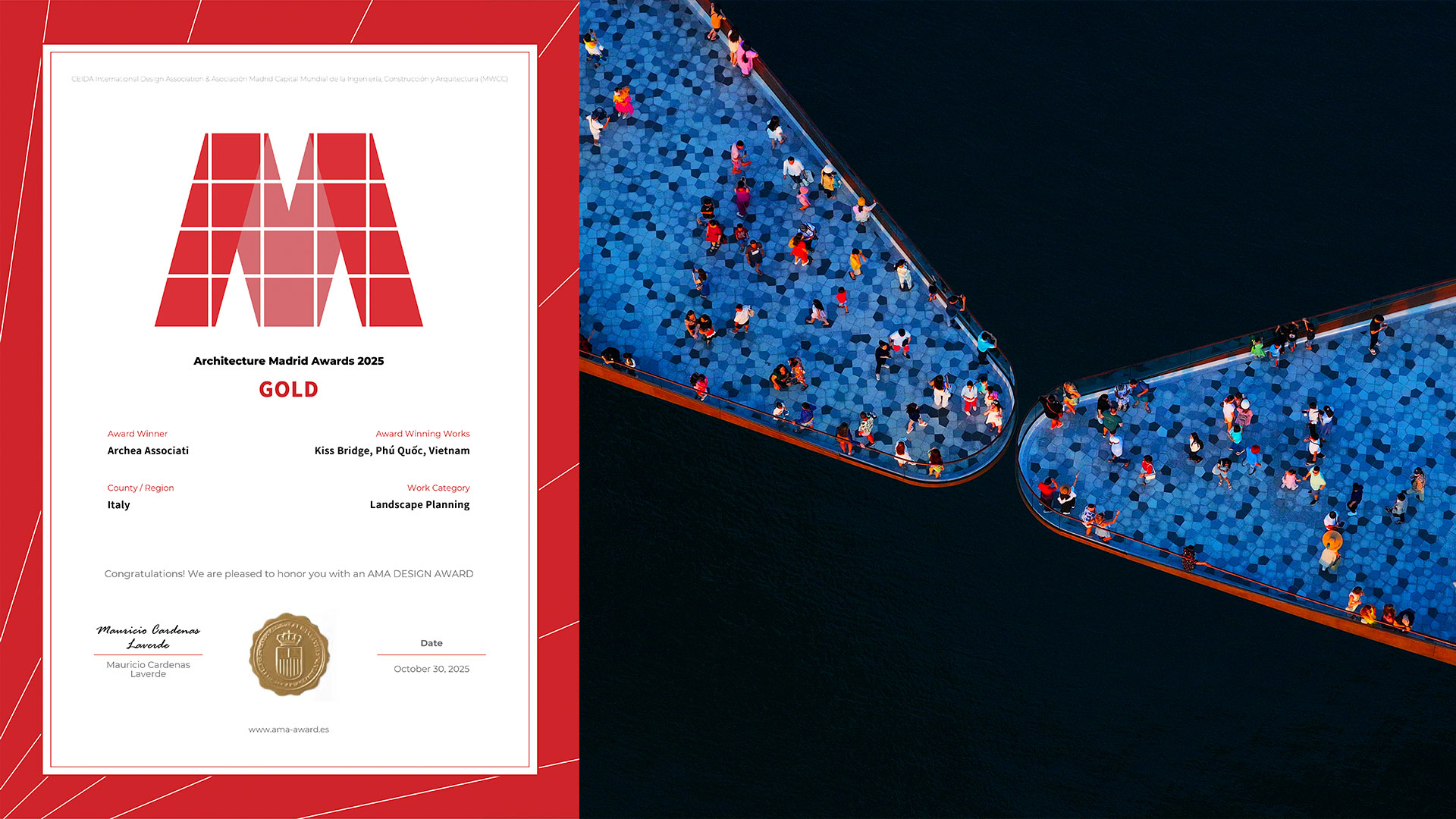 In occasione della Awards Ceremony di giovedì 30 Ottobre 2025, nell’ambito del rinomato premio “Architecture Madrid Awards” – edizione del 2025 – siamo lieti di comunicare che lo studio Archea Associati ha ricevuto due Gold Medal per i progetti “Kiss Bridge” e “Rocco B. Commisso Viola Park”, rispettivamente nelle categorie Landscape Planning e Culture & Sport Architecture.