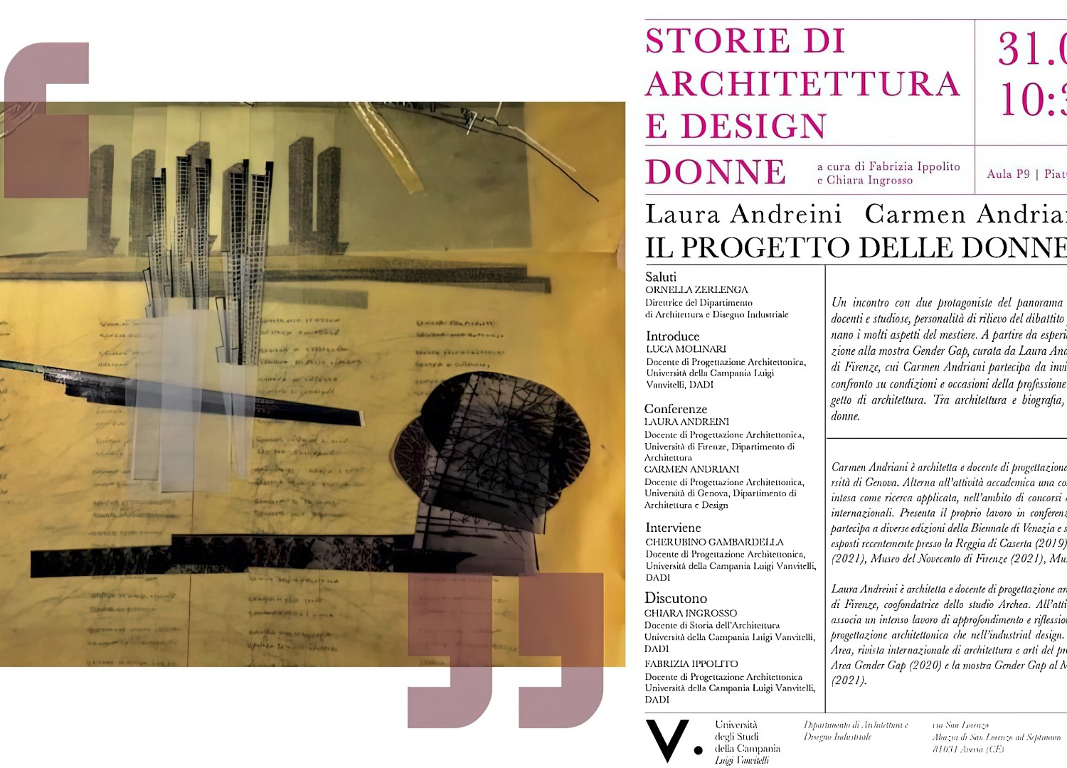Laura Andreini was invited, together with Carmen Andriani, to take part in the meeting “Storie di Architettura e Design Donne” curated by Fabrizia Ippolito and Chiara Ingrosso. The event was organised by the Dipartimento di Architettura e Disegno Industriale of the dell’Università degli Studi della Campania Luigi Vanvitelli and aimed to open a discussion on the condition and professional opportunities for women in the architecture and design. The discussion started from Laura Andreini’s curatorial experience in the “Gender Gap” exhibition at the Museo del Novecento in Florence, where Carmen Andriani participated as a guest. During the meeting, the role and contribution of women in the field of design was discussed, considering the perspectives of the two protagonists as designers, teachers, and researchers.