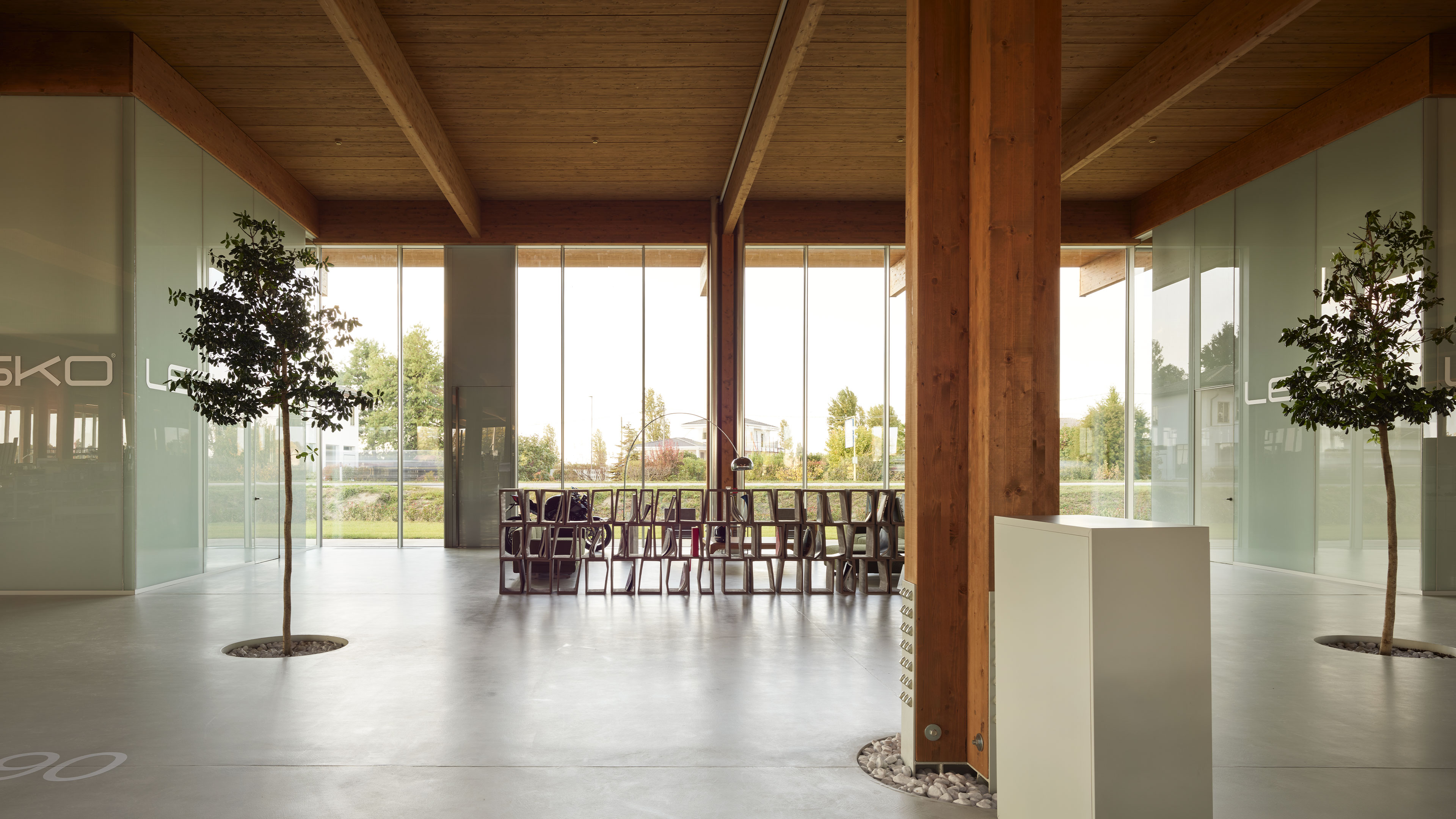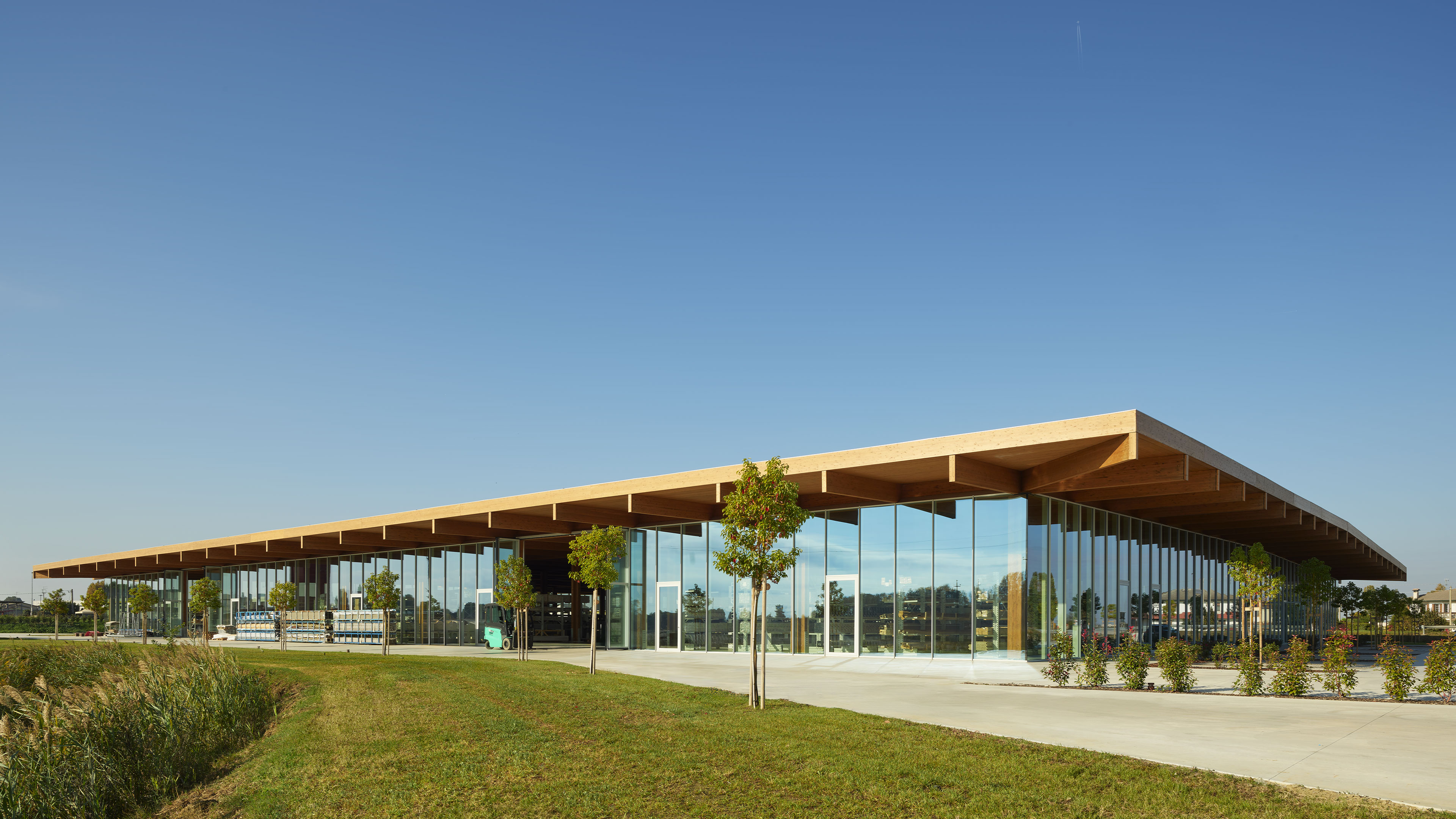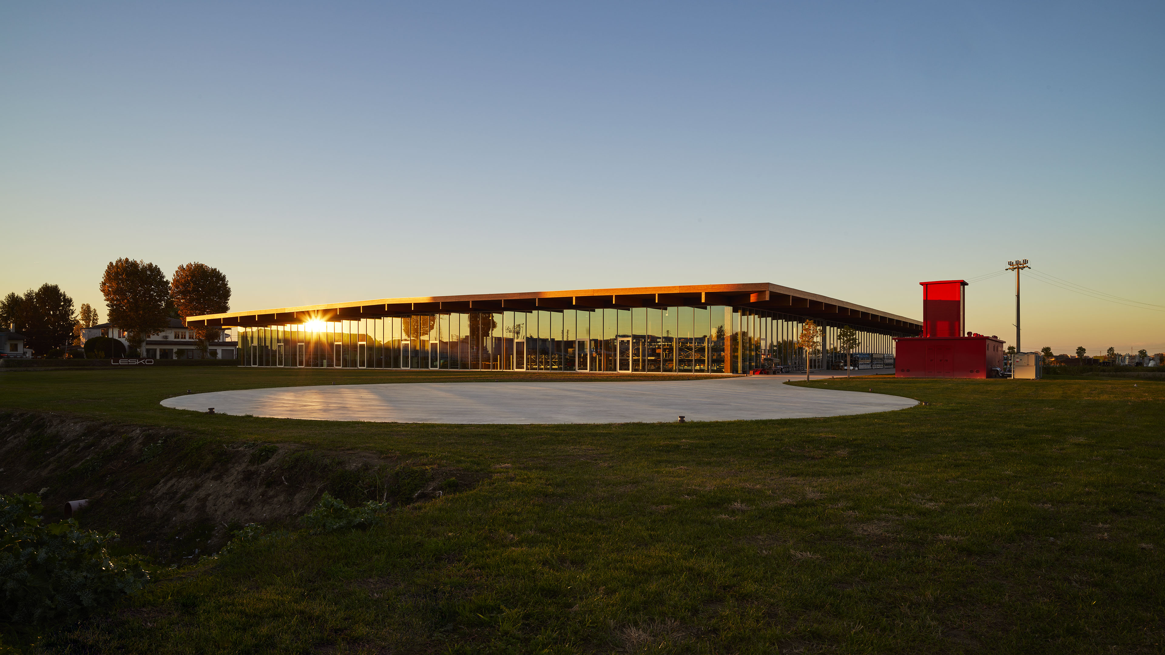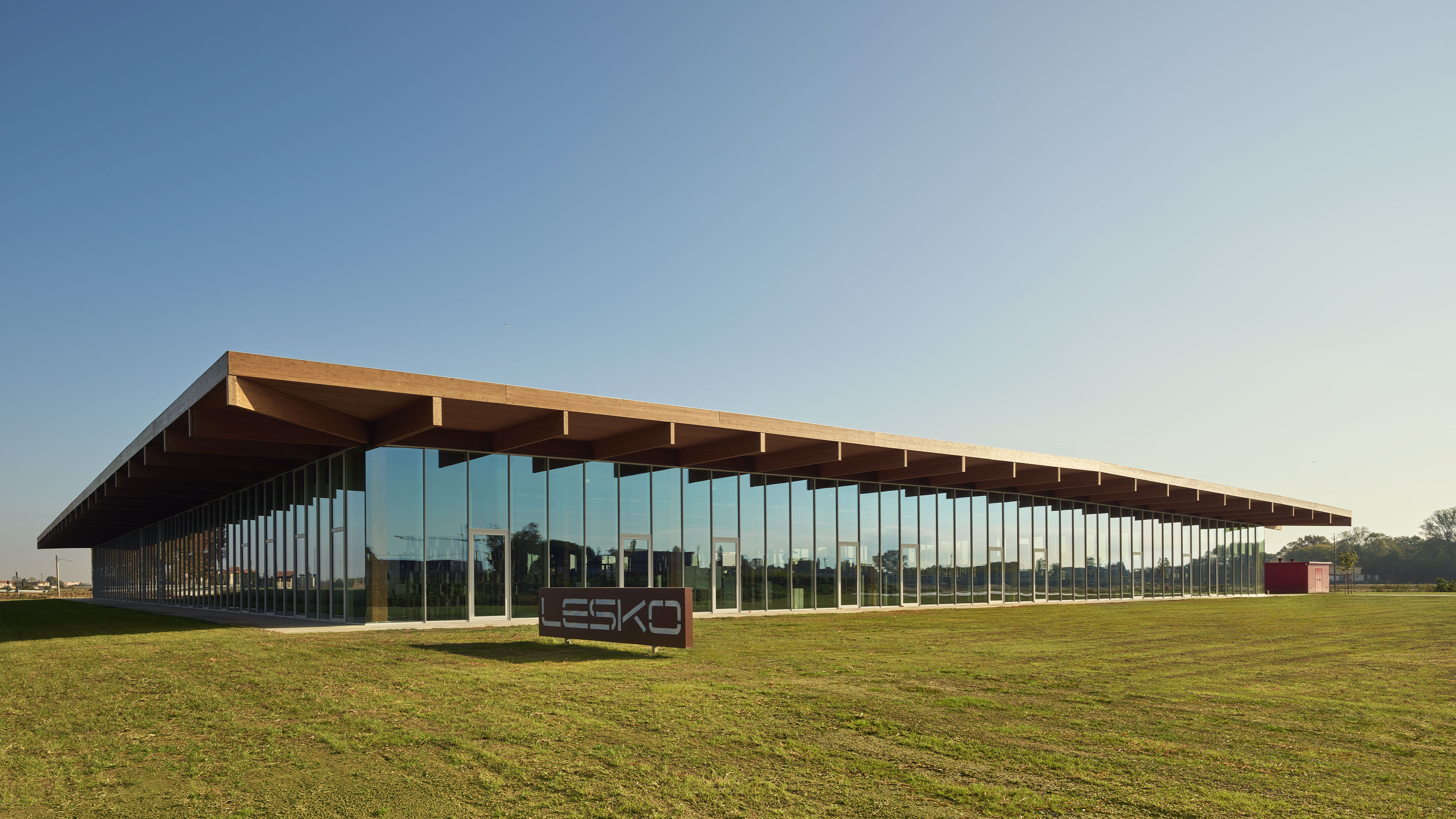 The project concerns the new factory of Lesko Srl company specialized in design and implementation of building envelope systems. The distinguishing feature of the building, despite its production function, is the total transparency: in fact, it is an entirely glazed structure, without any opaque surface. Structurally, the building is made entirely of wood, with planar main and secondary beams and cruciform pillars.