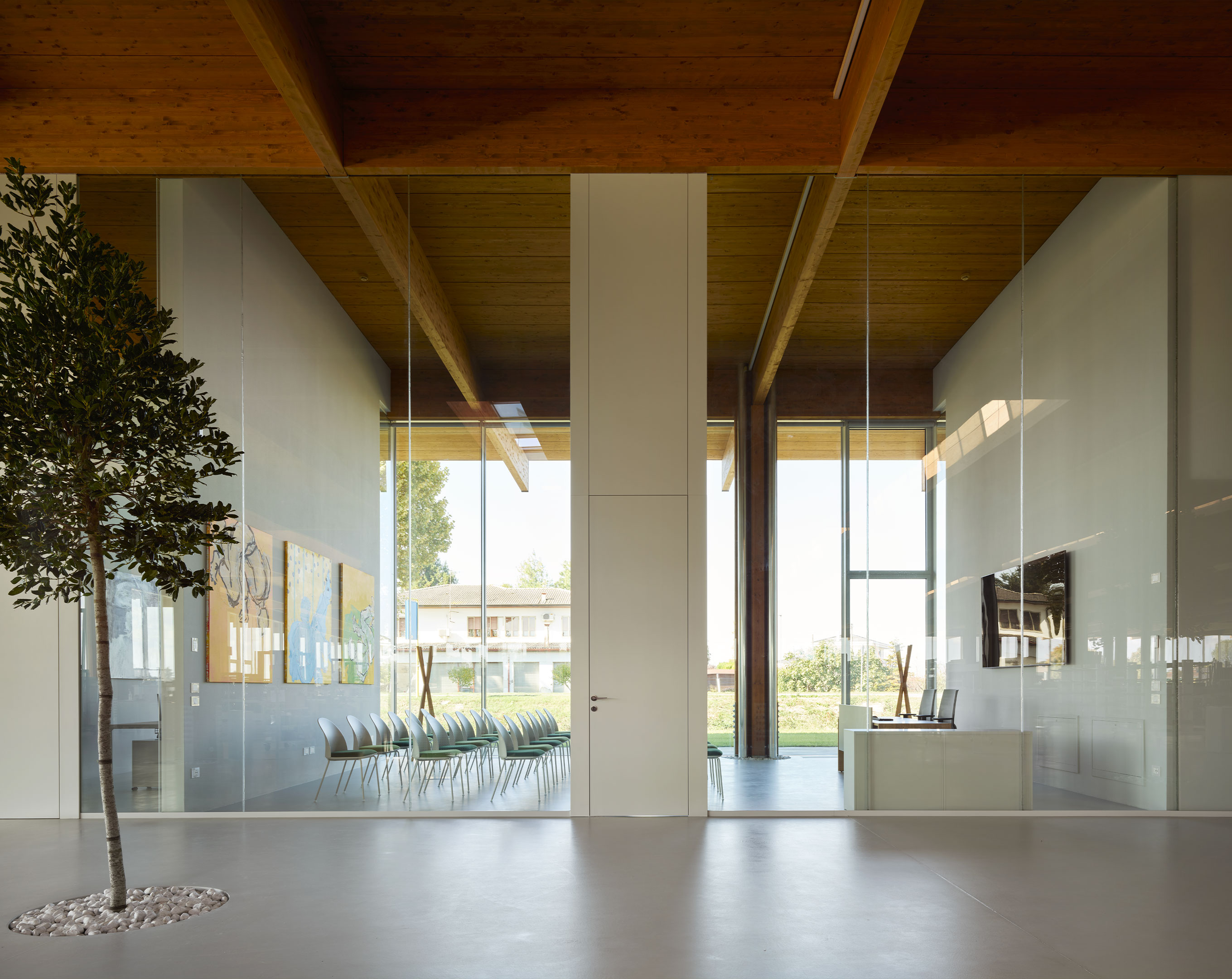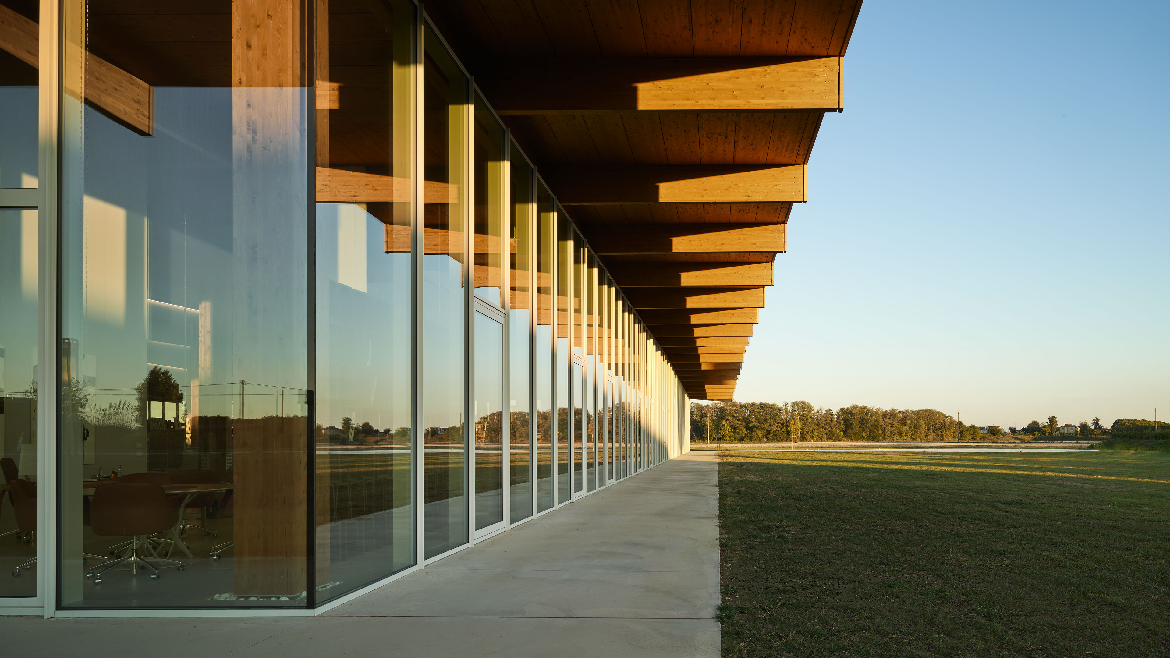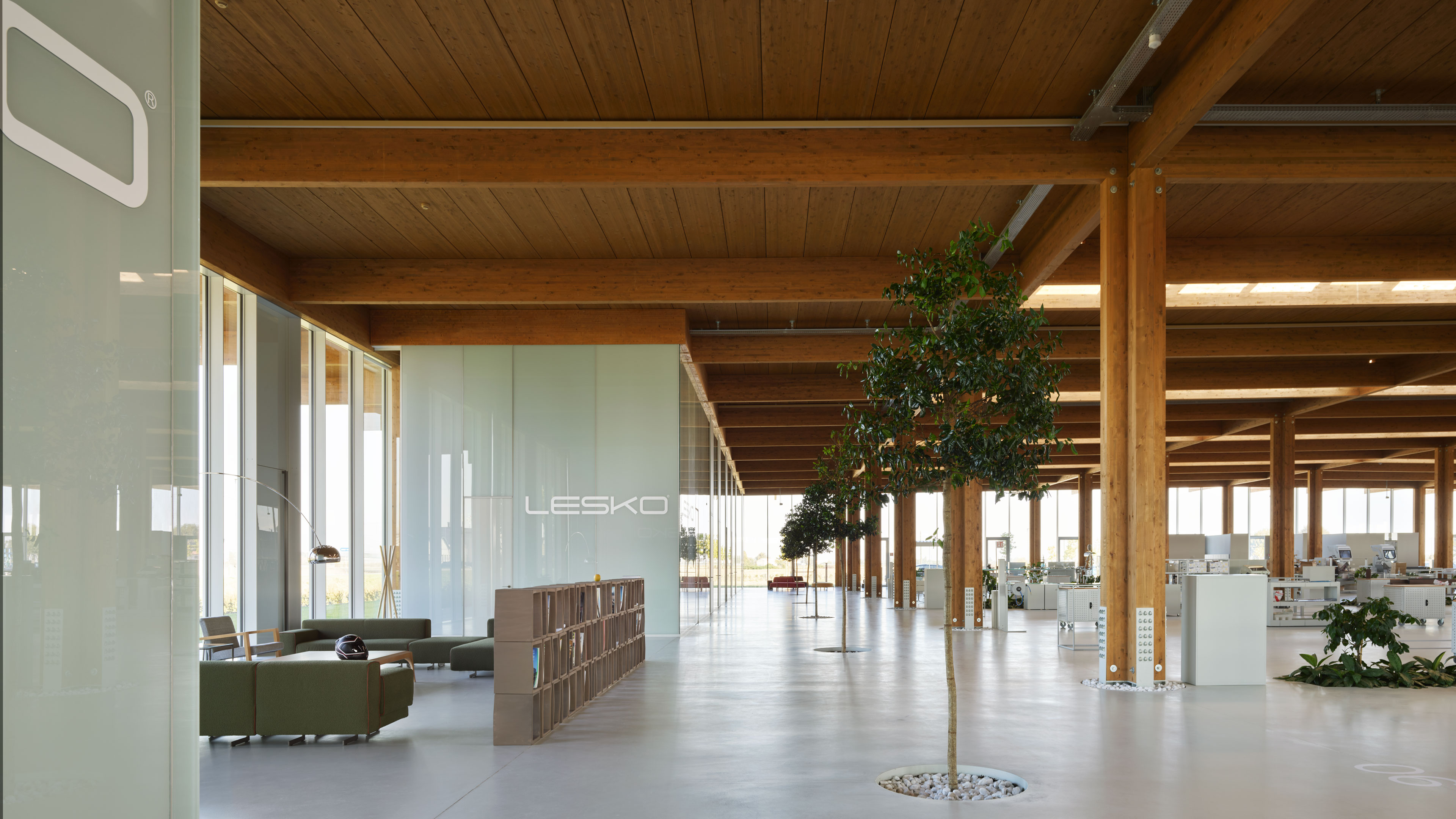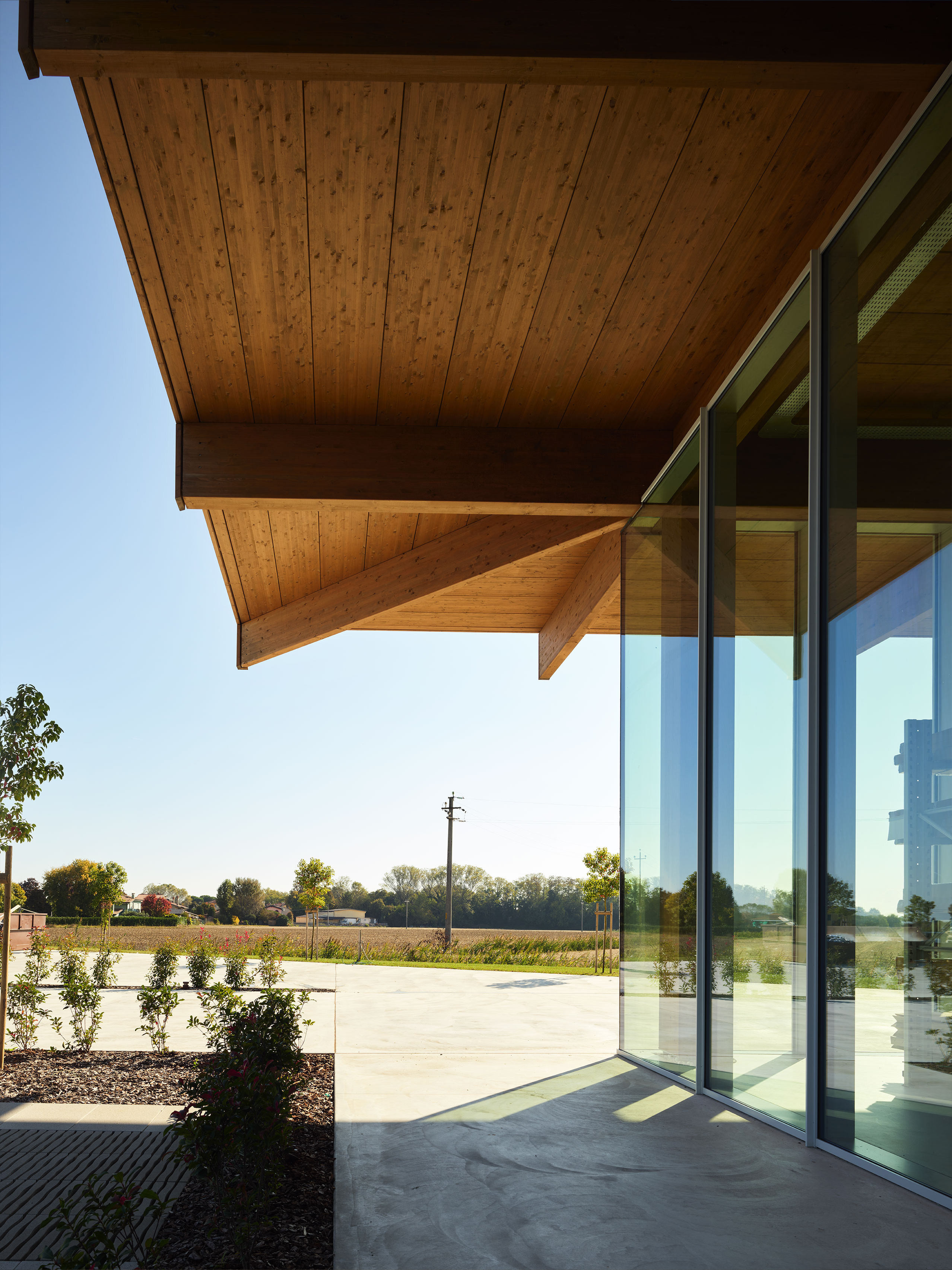 The project concerns the new factory of Lesko Srl company specialized in design and implementation of building envelope systems. The distinguishing feature of the building, despite its production function, is the total transparency: in fact, it is an entirely glazed structure, without any opaque surface. Structurally, the building is made entirely of wood, with planar main and secondary beams and cruciform pillars.