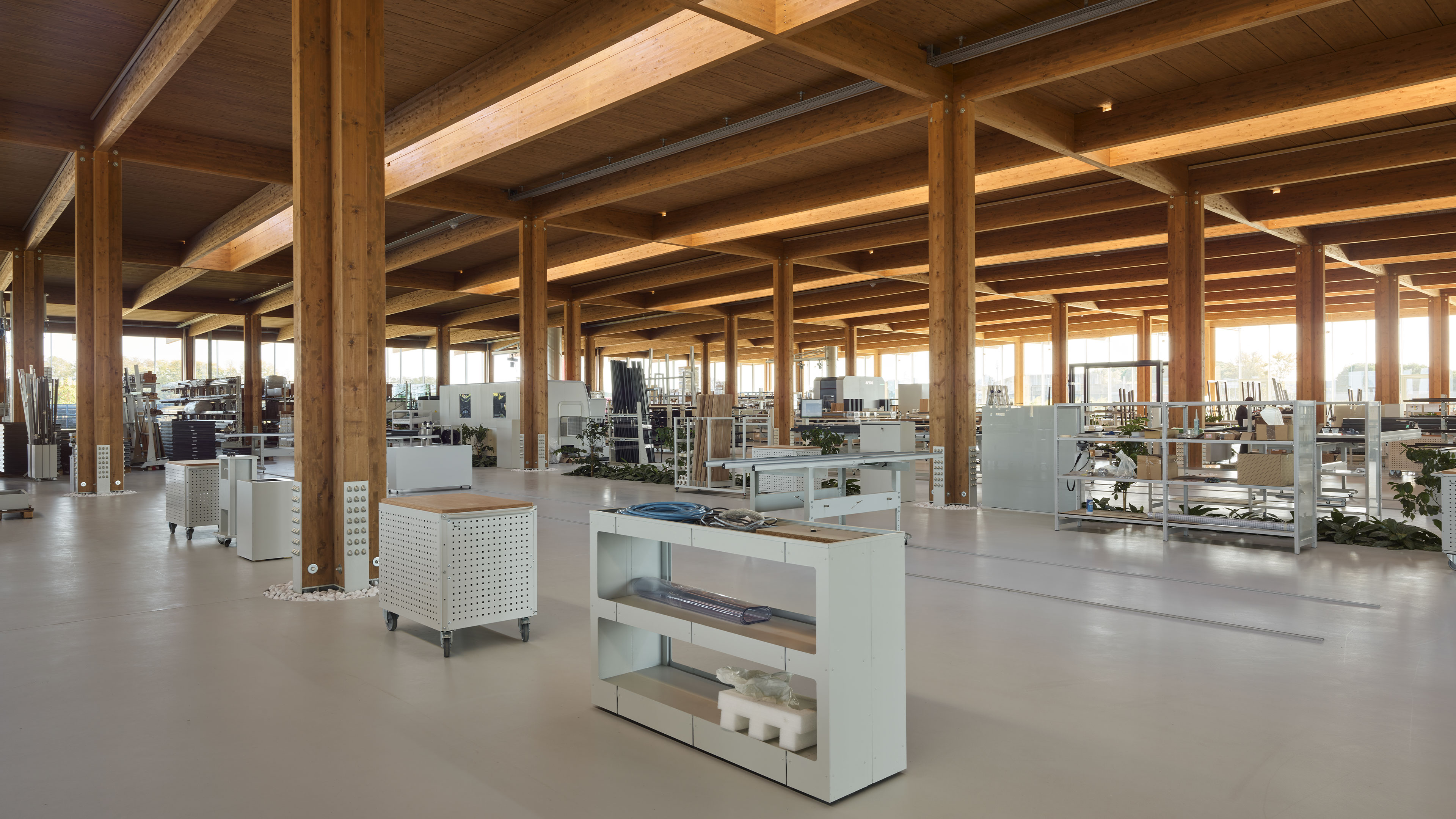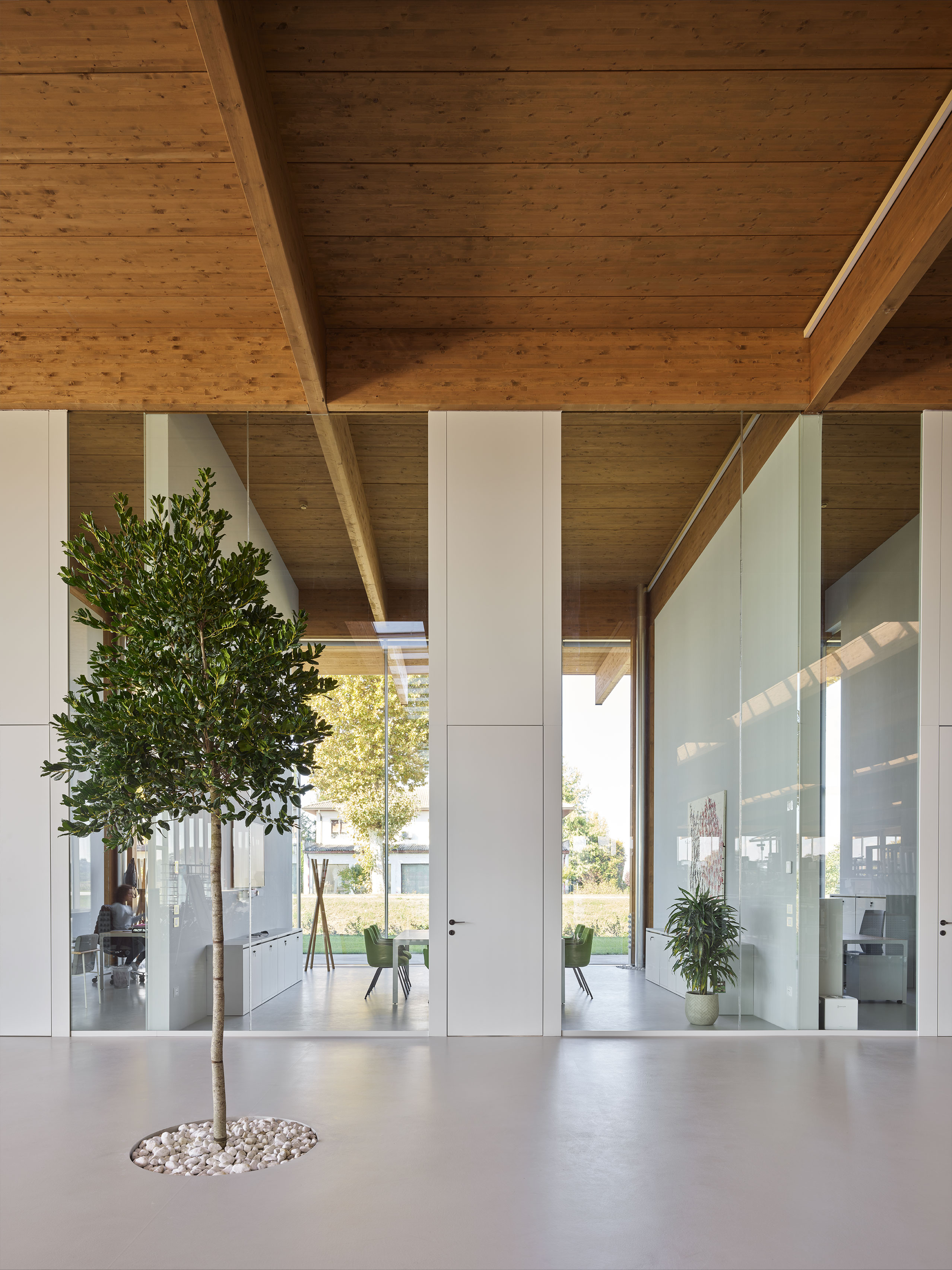 The building is developed exclusively on a single ground floor, where the production lines and the administrative part coexist harmoniously. This part is separated from the rest of the environment by elegant glass partitions that preserve its visibility and transparency. The production lines are not separated by traditional partitions or high shelving, but through pools of greenery and trees, which create a pleasant and stimulating work environment, promoting a dialogue between spaces and integrating nature within the production area.