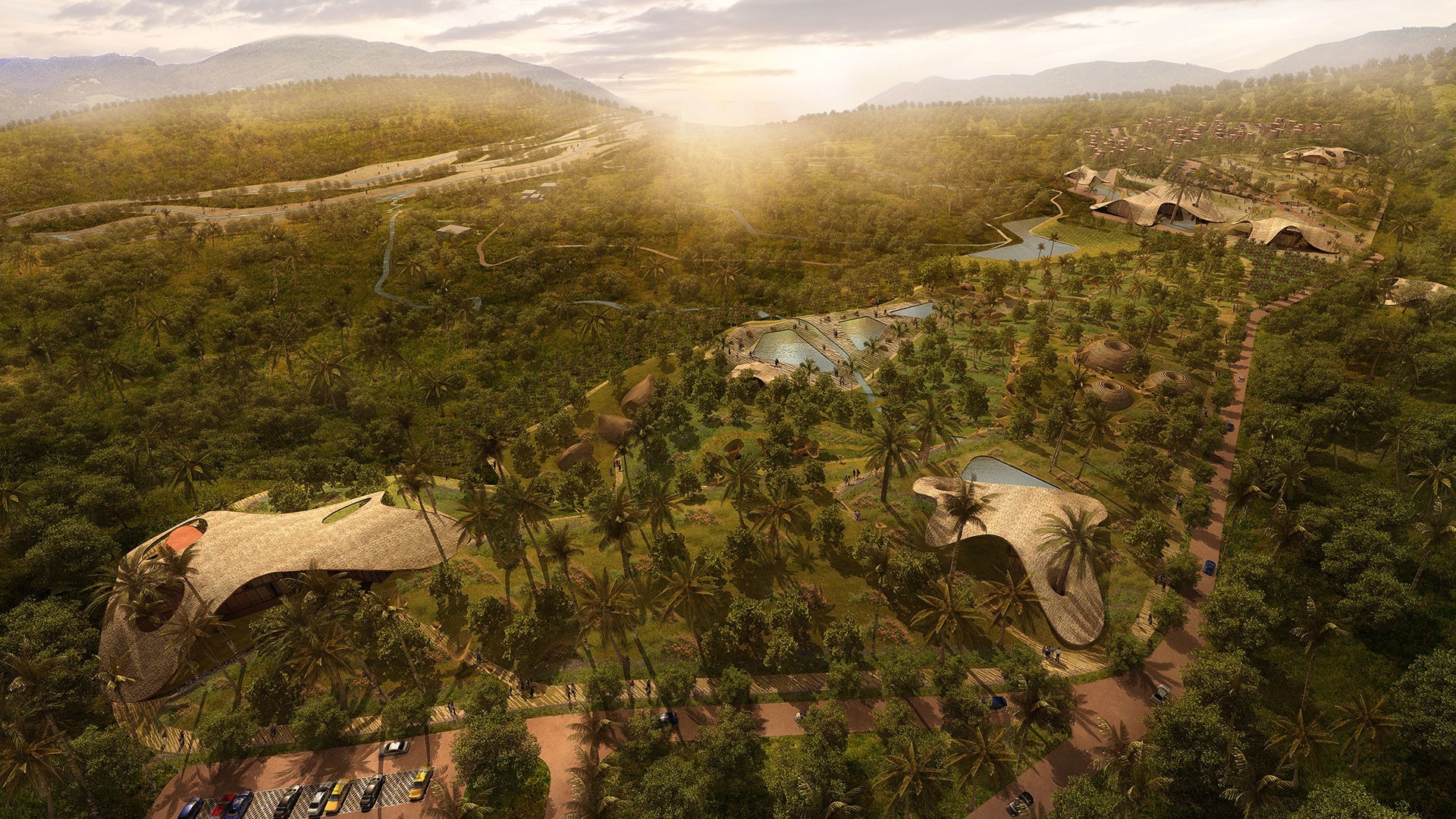 The primary functions are located inside simple buildings built with dry construction technologies, flexible for possible transformations and extensions and provided with large extroflexed curved roofs made of bamboo, designed to offer shelter during the long periods of rain and protection from the strong solar radiation in summer.