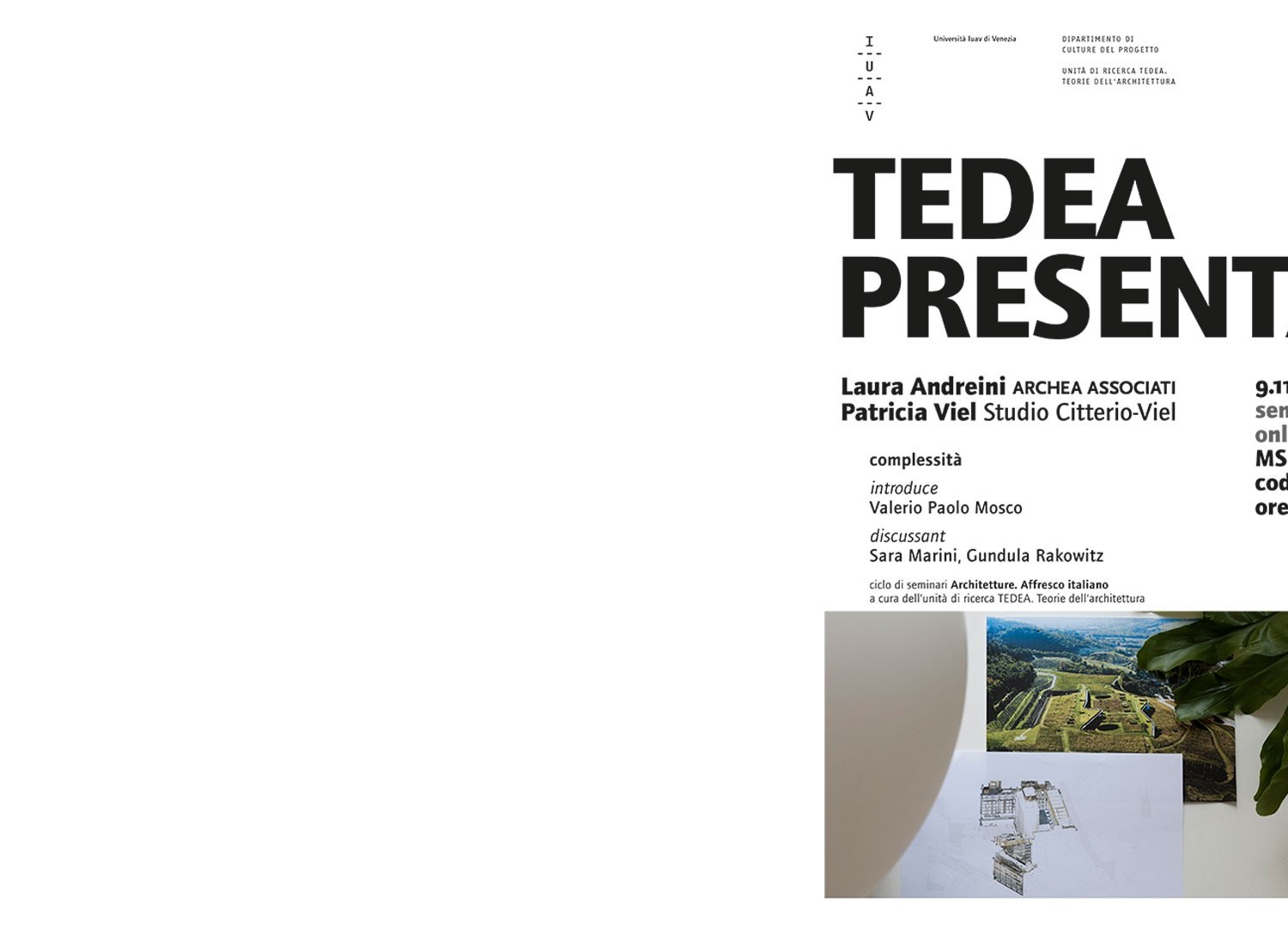 Nell’incontro del 9 novembre si confrontano con gli studenti le due architette e autrici Laura Andreini e Patricia Viel (Studio Citterio-Viel) che raccontano come la complessità sia una parte presente in ogni progetto, dal progetto più piccolo al progetto più grande, dal progetto più vicino a quello più lontano.