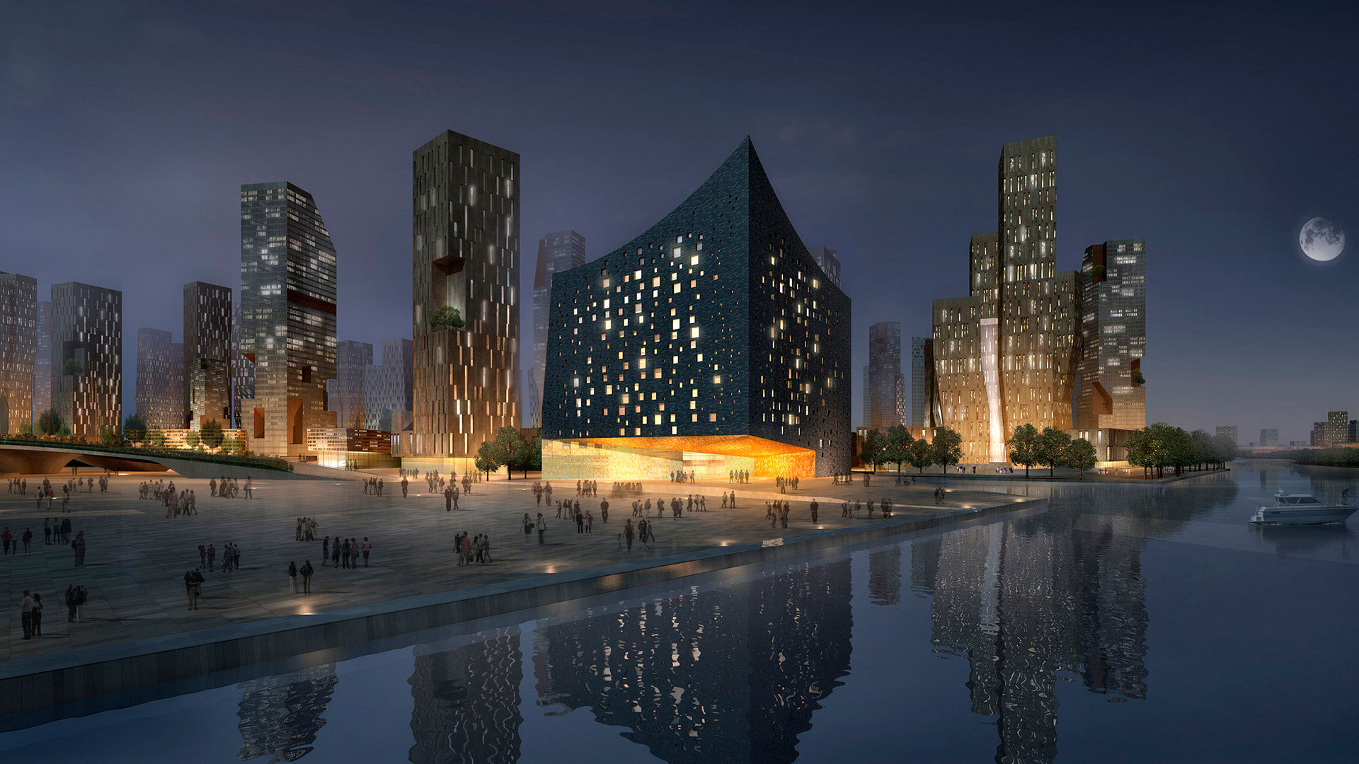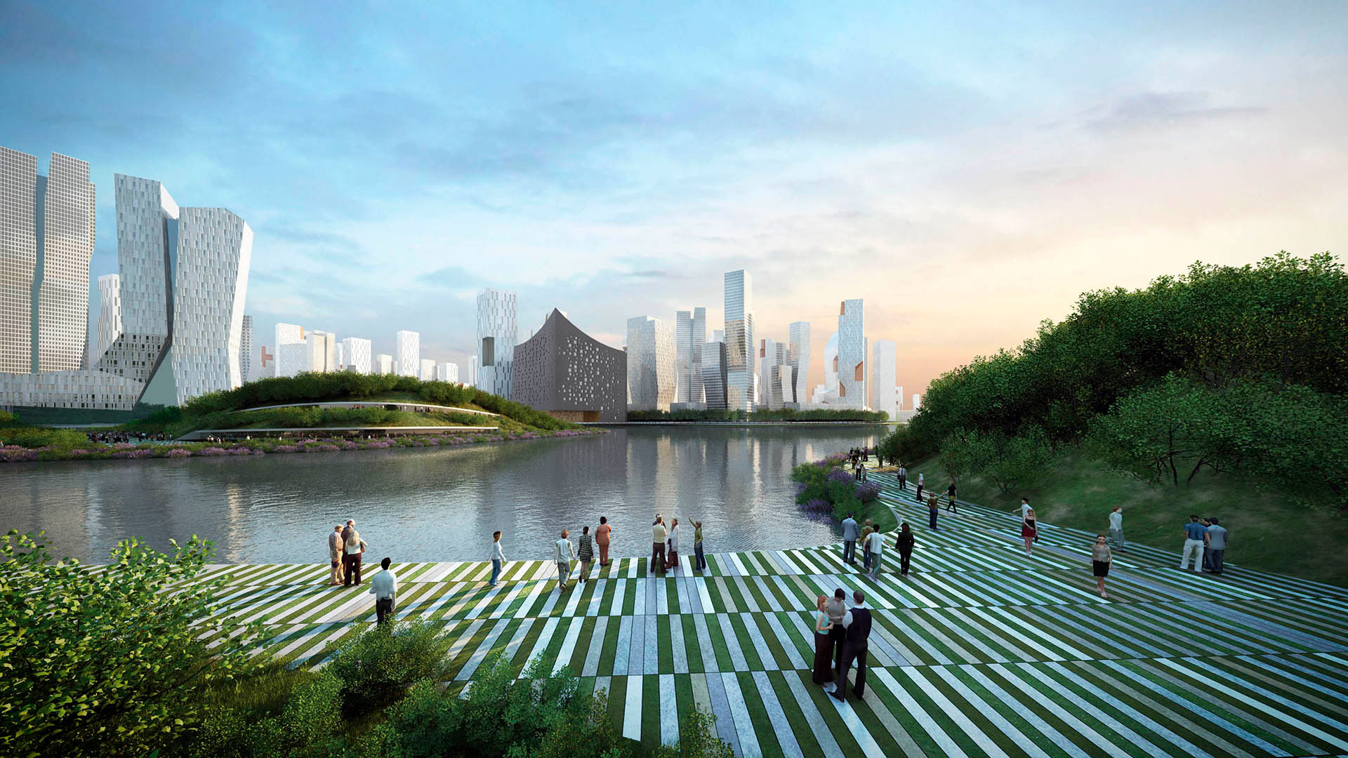 可持续性原则是整个项目的指导原则,伴随着人类规模的城市公共空间的新发现,其特点是雕塑般地标的不断发展,并与水道和绿地相结合。绿地被认为是一个共享自由时间的社区元素,由高度发展的供水系统和一个住宅结构整合而成,该住宅结构根据对古老胡同系统的重新诠释,追溯了中国城镇在四合院地块中的传统。交通由一个高效的停车系统整合而成,由两条快速路的主轴引导,但本质上是以公共交通和低速交通工具为基础,包括步行和骑自行车的方式,以通过重新引入步行和社区聚会场所来重塑街道生活。